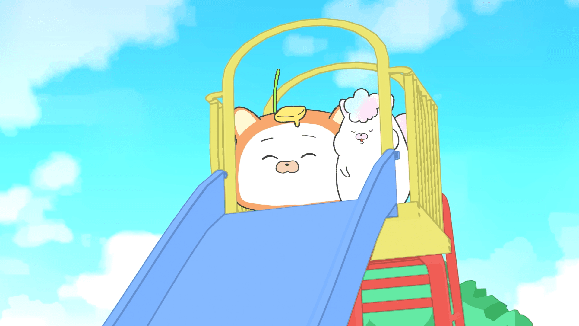 ついにぬいたちが公園まで来た!滑り台の上まで登ってみたけど、わたあめだけが怖くて滑れないみたい。頑張れ!